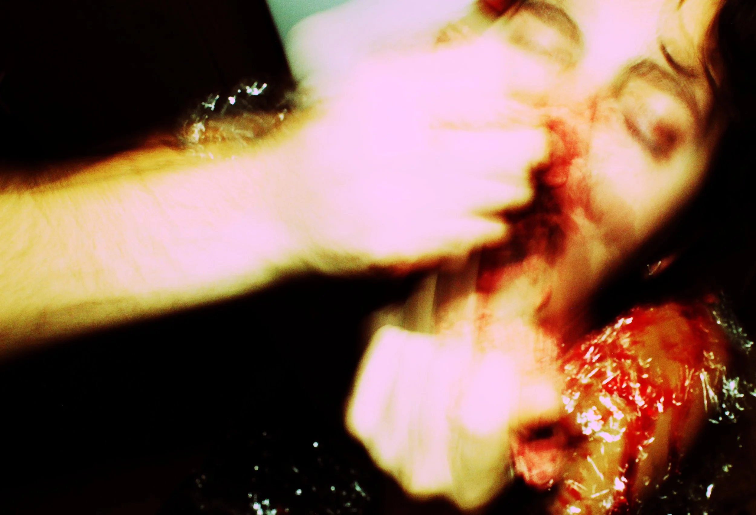 The final pictures display a male model devour raw meat (mincemeat and steak). Vivid contrast and warm dark colors. Blood is dripping from him and meat. His hunger makes him “blind” and ruthless, his face expressions show enjoyment in contrast with the violent body language. Long exposure for rough movement of the cannibal man. The model has meat on his body and head. The background is dark and display a kitchen floor for a more realistic result.
